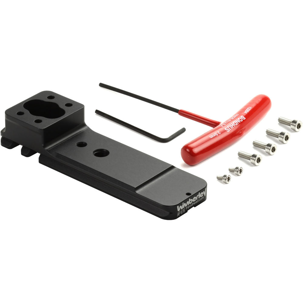 The Replacement Foot for Sony FE 600 f/4 GM OSS from Wimberley, made of black anodised 6061 aluminium and stainless steel, has a double-dovetail, Arca-type compatible mount that lets you attach accessories to the top as well as the bottom of the foot. When mounted on a tripod head, the low profile of this lightweight and durable lens foot provides a lower centre of gravity and better balance compared with the one originally supplied with the lens.